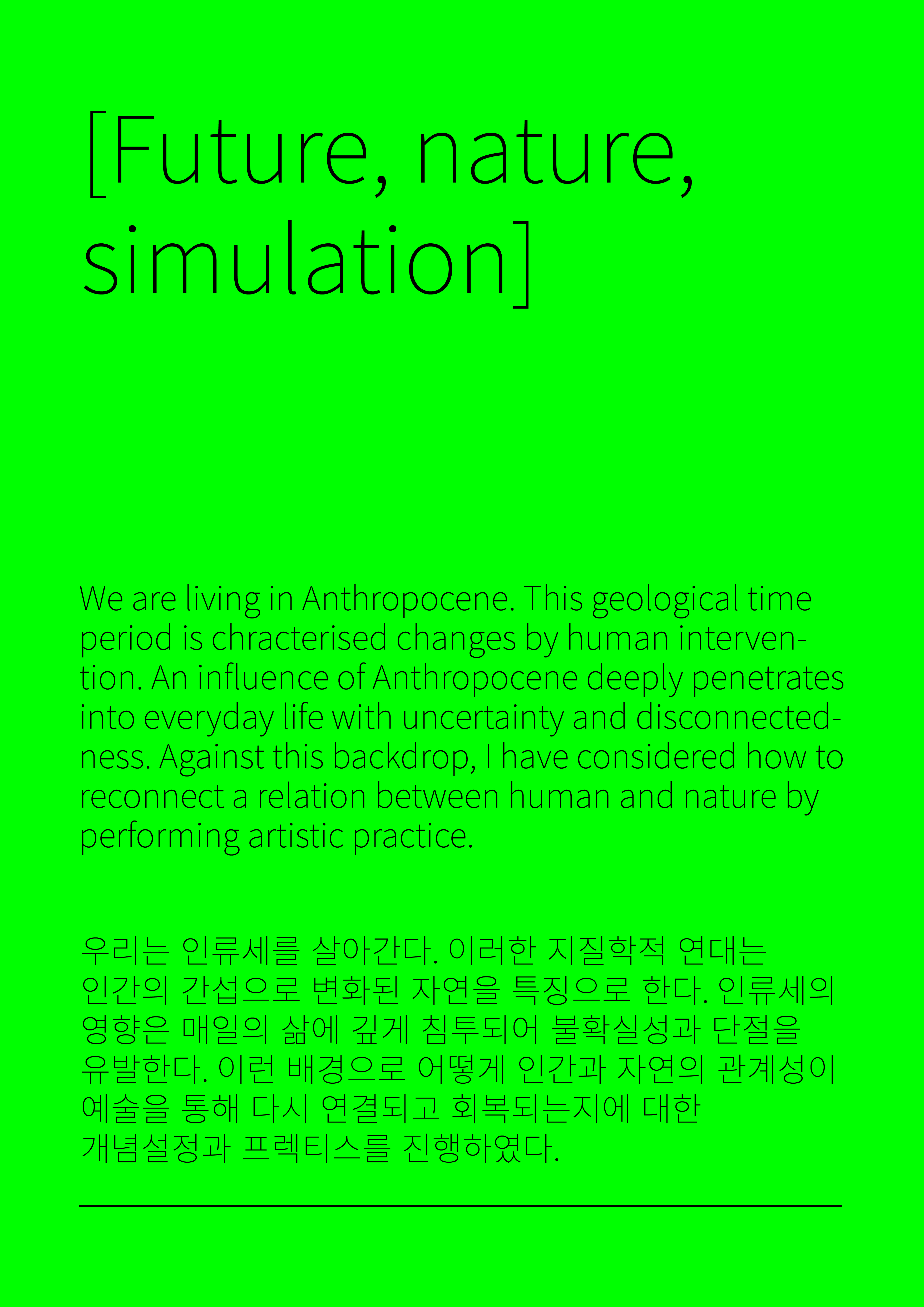 We are living in Anthropocene. This geological time period is chracterised changes by human intervention. An influence of Anthropocene deeply penetrates into everyday life with uncertainty and disconnectedness. Against this backdrop, I have considered how to reconnect a relation between human and nature by performing artistic practice.