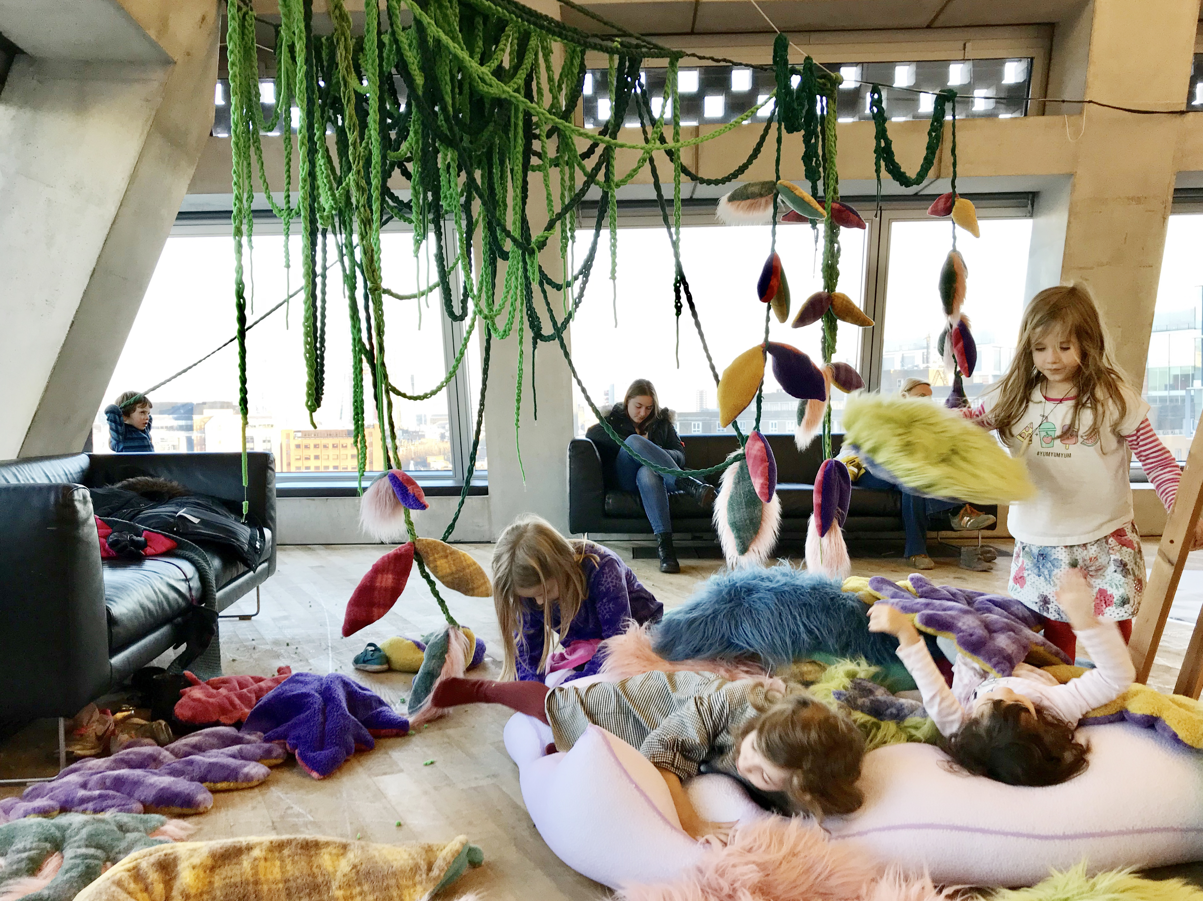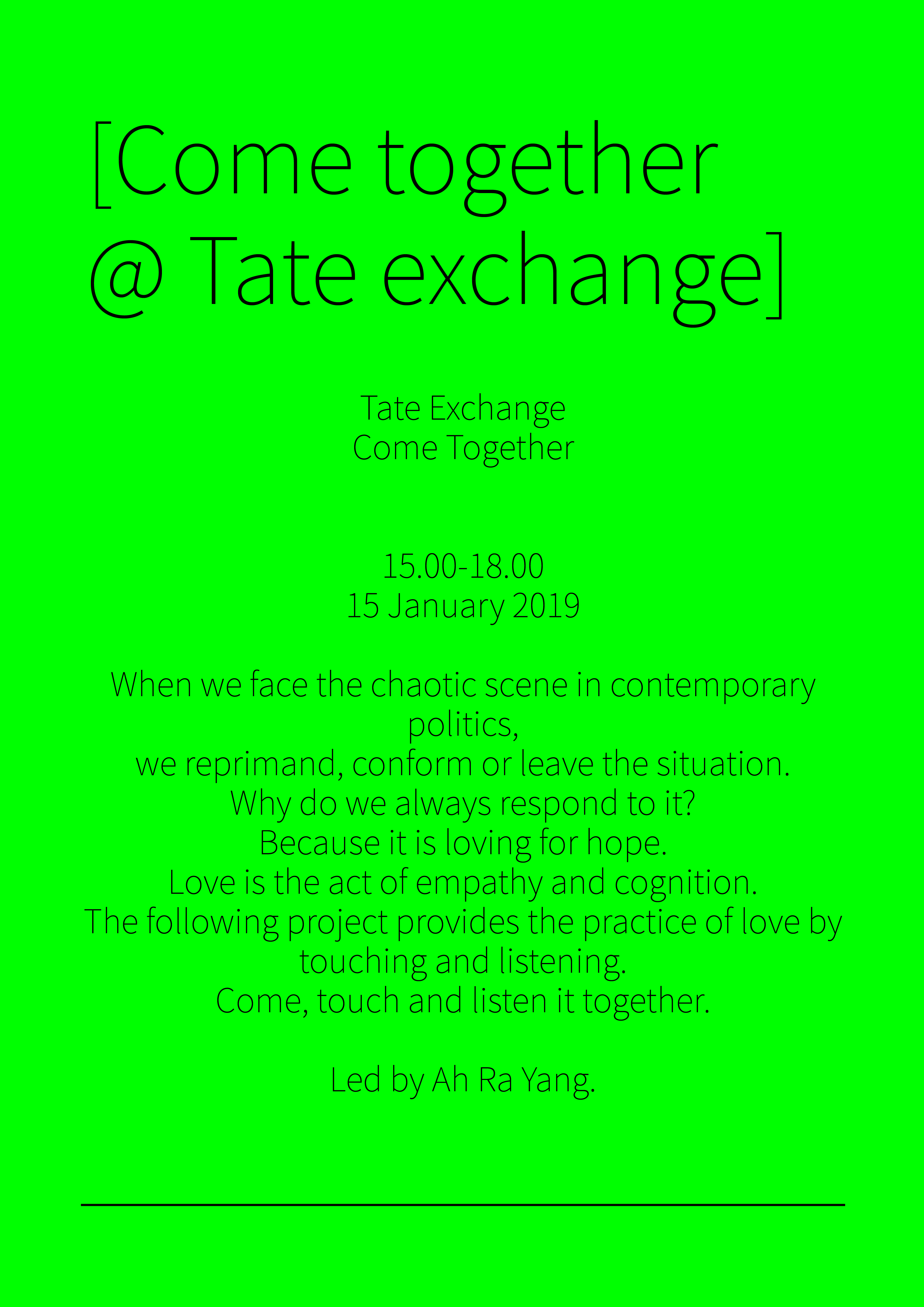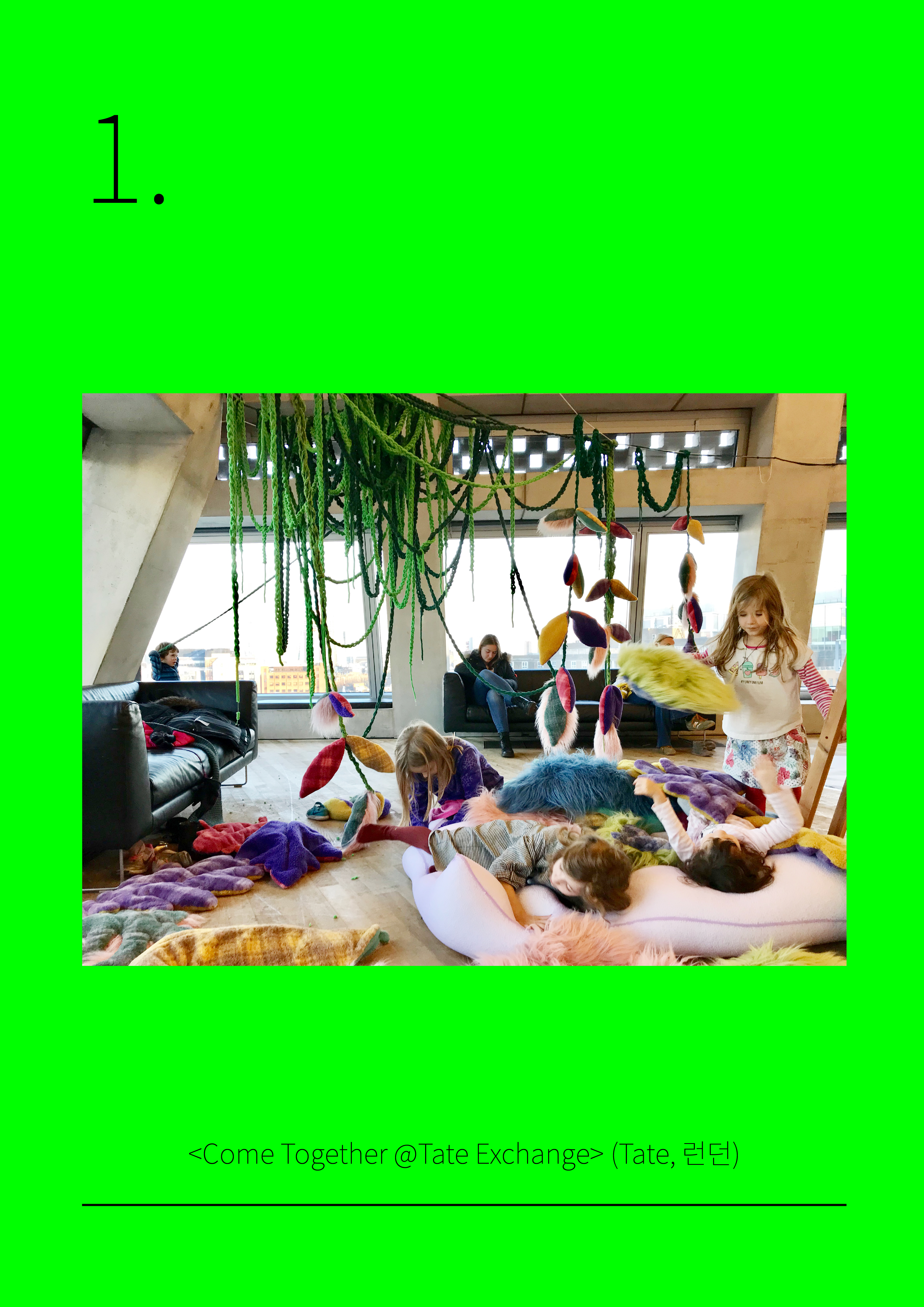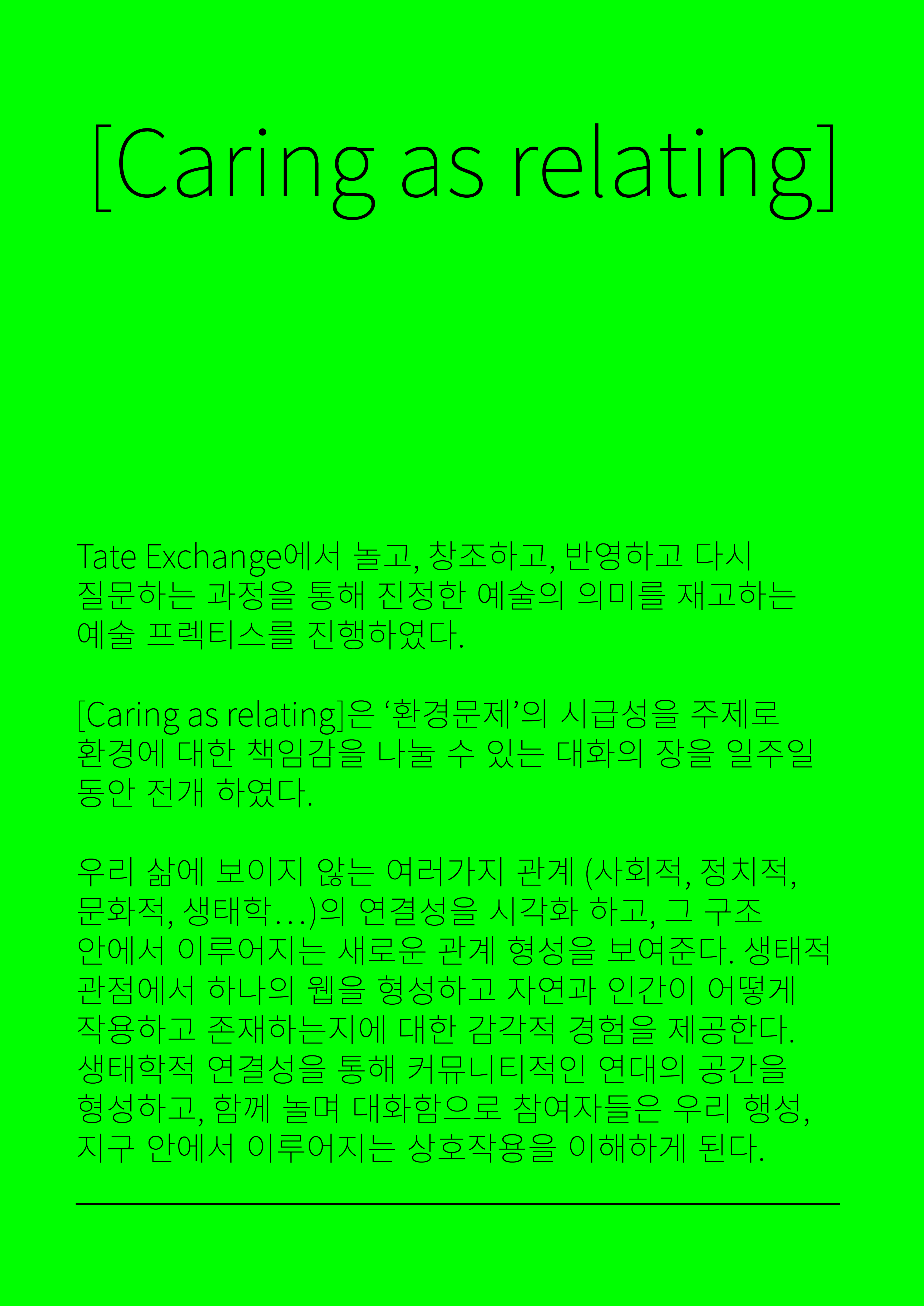 Tate Exchange์์ ๋๊ณ , ์ฐฝ์กฐํ๊ณ , ๋ฐ์ํ๊ณ ๋ค์ ์ง๋ฌธํ๋ ๊ณผ์ ์ ํตํด ์ง์ ํ ์์ ์ ์๋ฏธ๋ฅผ ์ฌ๊ณ ํ๋ ์์ ํ๋ ํฐ์ค๋ฅผ ์งํํ์๋ค. [Caring as relating]์ ‘ํ๊ฒฝ๋ฌธ์ ’์ ์๊ธ์ฑ์ ์ฃผ์ ๋ก ํ๊ฒฝ์ ๋ํ ์ฑ ์๊ฐ์ ๋๋ ์ ์๋ ๋ํ์ ์ฅ์ ์ผ์ฃผ์ผ ๋์ ์ ๊ฐํ์๋ค. ์ฐ๋ฆฌ ์ถ์ ๋ณด์ด์ง ์๋ ์ฌ๋ฌ๊ฐ์ง ๊ด๊ณ (์ฌํ์ , ์ ์น์ , ๋ฌธํ์ , ์ํํ…)์ ์ฐ๊ฒฐ์ฑ์ ์๊ฐํ ํ๊ณ , ๊ทธ ๊ตฌ์กฐ ์์์ ์ด๋ฃจ์ด์ง๋ ์๋ก์ด ๊ด๊ณ ํ์ฑ์ ๋ณด์ฌ์ค๋ค. ์ํ์ ๊ด์ ์์ ํ๋์ ์น์ ํ์ฑํ๊ณ ์์ฐ๊ณผ ์ธ๊ฐ์ด ์ด๋ป๊ฒ ์์ฉํ๊ณ ์กด์ฌํ๋์ง์ ๋ํ ๊ฐ๊ฐ์ ๊ฒฝํ์ ์ ๊ณตํ๋ค. ์ํํ์ ์ฐ๊ฒฐ์ฑ์ ํตํด ์ปค๋ฎค๋ํฐ์ ์ธ ์ฐ๋์ ๊ณต๊ฐ์ ํ์ฑํ๊ณ , ํจ๊ป ๋๋ฉฐ ๋ํํจ์ผ๋ก ์ฐธ์ฌ์๋ค์ ์ฐ๋ฆฌ ํ์ฑ, ์ง๊ตฌ ์์์ ์ด๋ฃจ์ด์ง๋ ์ํธ์์ฉ์ ์ดํดํ๊ฒ ๋๋ค.