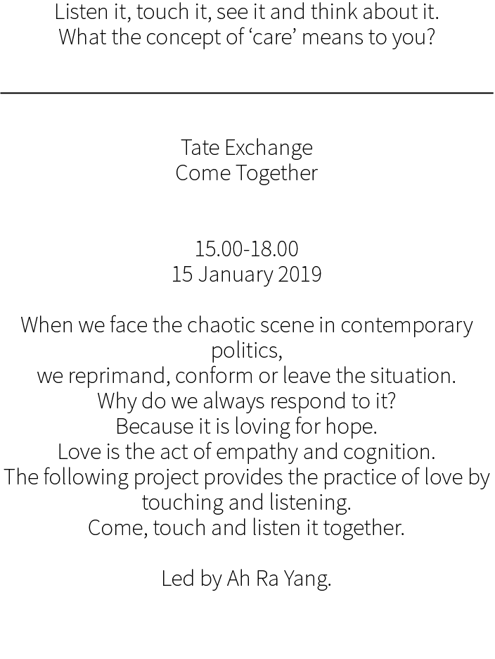 Tate Exchange์์ ๋๊ณ , ์ฐฝ์กฐํ๊ณ , ๋ฐ์ํ๊ณ ๋ค์ ์ง๋ฌธํ๋ ๊ณผ์ ์ ํตํด ์ง์ ํ ์์ ์ ์๋ฏธ๋ฅผ ์ฌ๊ณ ํ๋ ์์ ํ๋ ํฐ์ค๋ฅผ ์งํํ์๋ค. [Caring as relating]์ ‘ํ๊ฒฝ๋ฌธ์ ’์ ์๊ธ์ฑ์ ์ฃผ์ ๋ก ํ๊ฒฝ์ ๋ํ ์ฑ ์๊ฐ์ ๋๋ ์ ์๋ ๋ํ์ ์ฅ์ ์ผ์ฃผ์ผ ๋์ ์ ๊ฐํ์๋ค. ์ฐ๋ฆฌ ์ถ์ ๋ณด์ด์ง ์๋ ์ฌ๋ฌ๊ฐ์ง ๊ด๊ณ (์ฌํ์ , ์ ์น์ , ๋ฌธํ์ , ์ํํ…)์ ์ฐ๊ฒฐ์ฑ์ ์๊ฐํ ํ๊ณ , ๊ทธ ๊ตฌ์กฐ ์์์ ์ด๋ฃจ์ด์ง๋ ์๋ก์ด ๊ด๊ณ ํ์ฑ์ ๋ณด์ฌ์ค๋ค. ์ํ์ ๊ด์ ์์ ํ๋์ ์น์ ํ์ฑํ๊ณ ์์ฐ๊ณผ ์ธ๊ฐ์ด ์ด๋ป๊ฒ ์์ฉํ๊ณ ์กด์ฌํ๋์ง์ ๋ํ ๊ฐ๊ฐ์ ๊ฒฝํ์ ์ ๊ณตํ๋ค. ์ํํ์ ์ฐ๊ฒฐ์ฑ์ ํตํด ์ปค๋ฎค๋ํฐ์ ์ธ ์ฐ๋์ ๊ณต๊ฐ์ ํ์ฑํ๊ณ , ํจ๊ป ๋๋ฉฐ ๋ํํจ์ผ๋ก ์ฐธ์ฌ์๋ค์ ์ฐ๋ฆฌ ํ์ฑ, ์ง๊ตฌ ์์์ ์ด๋ฃจ์ด์ง๋ ์ํธ์์ฉ์ ์ดํดํ๊ฒ ๋๋ค.