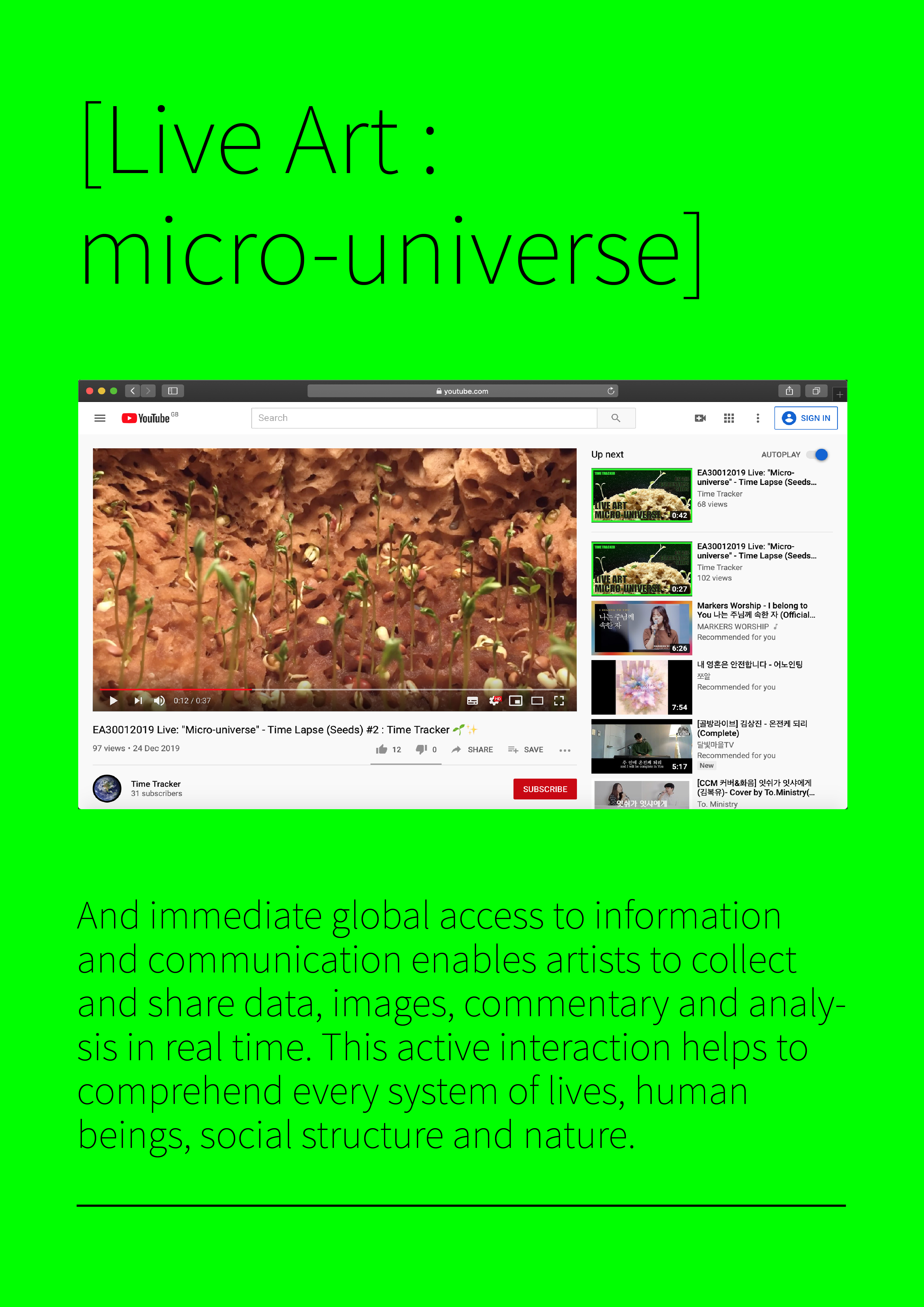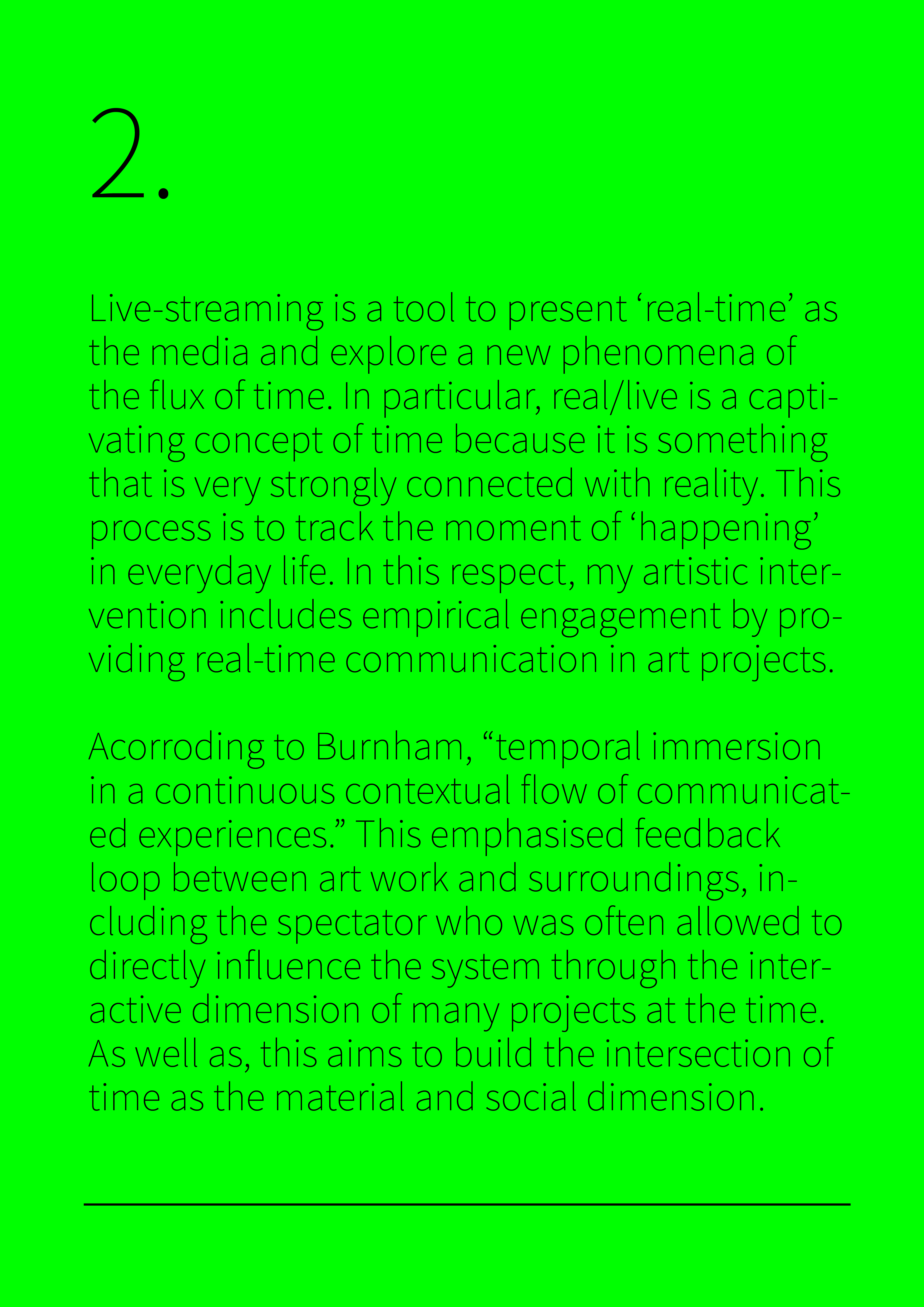 Live-streaming is a tool to present ‘real-time’ as the media and explore a new phenomena of the flux of time. In particular, real/live is a captivating concept of time because it is something that is very strongly connected with reality. This process is to track the moment of ‘happening’ in everyday life. In this respect, my artistic intervention includes empirical engagement by providing real-time communication in art projects. Acorroding to Burnham, “temporal immersion in a continuous contextual flow of communicated experiences.” This emphasised feedback loop between art work and surroundings, including the spectator who was often allowed to directly influence the system through the interactive dimension of many projects at the time. As well as, this aims to build the intersection of time as the material and social dimension. And immediate global access to information and communication enables artists to collect and share data, images, commentary and analysis in real time. This active interaction helps to comprehend every system of lives, human beings, social structure and nature.
