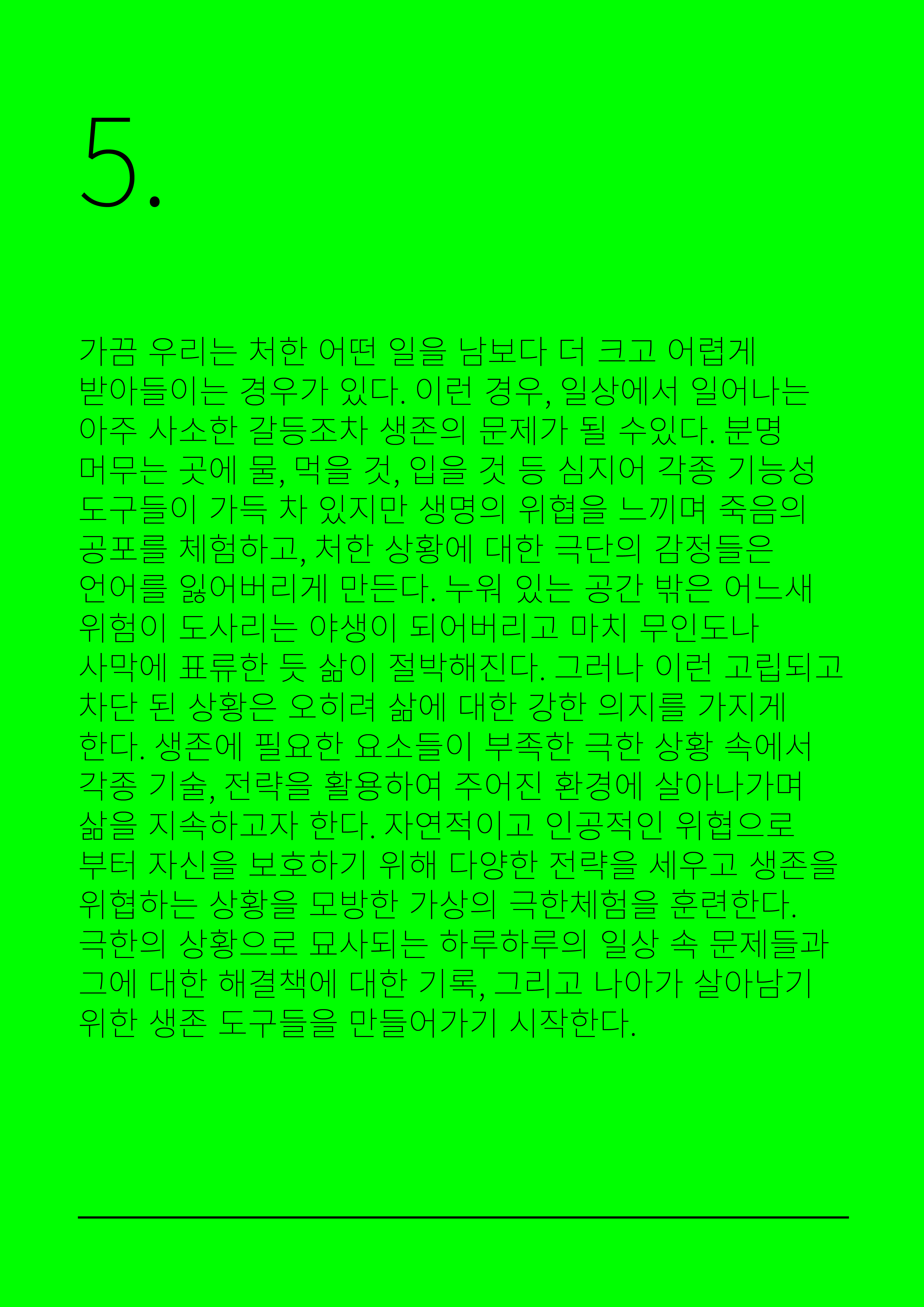 ๊ฐ๋ ์ฐ๋ฆฌ๋ ์ฒํ ์ด๋ค ์ผ์ ๋จ๋ณด๋ค ๋ ํฌ๊ณ ์ด๋ ต๊ฒ ๋ฐ์๋ค์ด๋ ๊ฒฝ์ฐ๊ฐ ์๋ค. ์ด๋ฐ ๊ฒฝ์ฐ, ์ผ์์์ ์ผ์ด๋๋ ์์ฃผ ์ฌ์ํ ๊ฐ๋ฑ์กฐ์ฐจ ์์กด์ ๋ฌธ์ ๊ฐ ๋ ์์๋ค. ๋ถ๋ช ๋จธ๋ฌด๋ ๊ณณ์ ๋ฌผ, ๋จน์ ๊ฒ, ์ ์ ๊ฒ ๋ฑ ์ฌ์ง์ด ๊ฐ์ข ๊ธฐ๋ฅ์ฑ ๋๊ตฌ๋ค์ด ๊ฐ๋ ์ฐจ ์์ง๋ง ์๋ช ์ ์ํ์ ๋๋ผ๋ฉฐ ์ฃฝ์์ ๊ณตํฌ๋ฅผ ์ฒดํํ๊ณ , ์ฒํ ์ํฉ์ ๋ํ ๊ทน๋จ์ ๊ฐ์ ๋ค์ ์ธ์ด๋ฅผ ์์ด๋ฒ๋ฆฌ๊ฒ ๋ง๋ ๋ค. ๋์ ์๋ ๊ณต๊ฐ ๋ฐ์ ์ด๋์ ์ํ์ด ๋์ฌ๋ฆฌ๋ ์ผ์์ด ๋์ด๋ฒ๋ฆฌ๊ณ ๋ง์น ๋ฌด์ธ๋๋ ์ฌ๋ง์ ํ๋ฅํ ๋ฏ ์ถ์ด ์ ๋ฐํด์ง๋ค. ๊ทธ๋ฌ๋ ์ด๋ฐ ๊ณ ๋ฆฝ๋๊ณ ์ฐจ๋จ ๋ ์ํฉ์ ์คํ๋ ค ์ถ์ ๋ํ ๊ฐํ ์์ง๋ฅผ ๊ฐ์ง๊ฒ ํ๋ค. ์์กด์ ํ์ํ ์์๋ค์ด ๋ถ์กฑํ ๊ทนํ ์ํฉ ์์์ ๊ฐ์ข ๊ธฐ์ , ์ ๋ต์ ํ์ฉํ์ฌ ์ฃผ์ด์ง ํ๊ฒฝ์ ์ด์๋๊ฐ๋ฉฐ ์ถ์ ์ง์ํ๊ณ ์ ํ๋ค. ์์ฐ์ ์ด๊ณ ์ธ๊ณต์ ์ธ ์ํ์ผ๋ก ๋ถํฐ ์์ ์ ๋ณดํธํ๊ธฐ ์ํด ๋ค์ํ ์ ๋ต์ ์ธ์ฐ๊ณ ์์กด์ ์ํํ๋ ์ํฉ์ ๋ชจ๋ฐฉํ ๊ฐ์์ ๊ทนํ์ฒดํ์ ํ๋ จํ๋ค. ๊ทนํ์ ์ํฉ์ผ๋ก ๋ฌ์ฌ๋๋ ํ๋ฃจํ๋ฃจ์ ์ผ์ ์ ๋ฌธ์ ๋ค๊ณผ ๊ทธ์ ๋ํ ํด๊ฒฐ์ฑ ์ ๋ํ ๊ธฐ๋ก, ๊ทธ๋ฆฌ๊ณ ๋์๊ฐ ์ด์๋จ๊ธฐ ์ํ ์์กด ๋๊ตฌ๋ค์ ๋ง๋ค์ด๊ฐ๊ธฐ ์์ํ๋ค. ๋ฐ๋ผ์ ๋์ ์์ ์ ์์กด ์ ๋ต์ ๊ธฐ๋ฐํ ์์กด ๋๊ตฌ๋ฅผ ๊ณ ์ํด๊ฐ๋ ๊ณผ์ ์ผ๋ก ์ผ์ข ์ ์๊ฐ ๋งค๋ด์ผ์ ๊ธฐ๋กํ๋ค. ์ด๋ ์ธ์์ ๋ชจ๋ ๋๊ด์ ์ ํญํ์ฌ ์ด์๊ฐ ์ ์๋ ํ์ ๋ํ ์ฐ๊ตฌ๋ก์ ์๋ฏธ๋ฅผ ๊ฐ์ง๋ค. ๋ชจ๋ ์ํ์ ๊ธฐ๋ฅ์ ์ผ๋ก ์์กด์ ์ํ ๋๋ฆ์ ์ด์ ๋ฅผ ๋ด๊ณ ์์ผ๋ฉฐ, ์์์ฃผ๊ฐ์ ๊ธฐ๋ณธ์ ์ธ ์ธ๊ฐ์ ์๊ตฌ ์ถฉ์กฑ์ ๋์ด์ ์กด์์ ๋ํ ์ธก๋ฉด์ ๋ค๋ฃฌ๋ค.