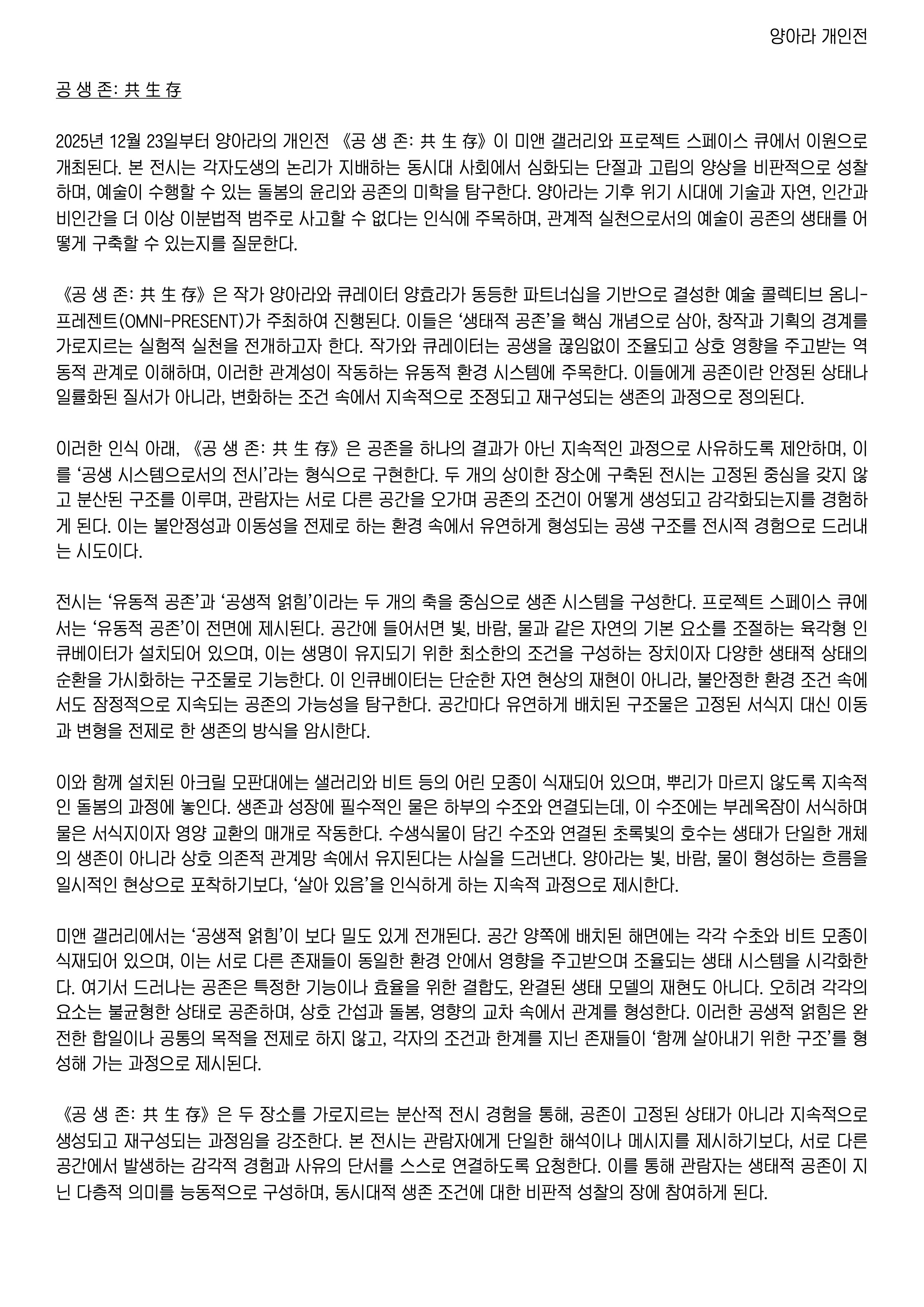 γ곡 μ μ‘΄: ε ± η εγμ λ―Έμ€κ°€λ¬λ¦¬μ νλ‘μ νΈ μ€νμ΄μ€ ν, λ κ°μ μλ‘ λ€λ₯Έ 곡κ°μμ λμμ μ§νλλ μ΄μ κ°μΈμ μΌλ‘ ꡬμ±λλ€. νλμ μ£Όμ κ° λ μ₯μμμ λμΌνκ² λ°λ³΅λλ κ²μ΄ μλλΌ, κ° κ³΅κ°μ 쑰건과 λ§₯λ½μ λ°λΌ μλ‘ λ€λ₯Έ λ°©μμΌλ‘ λ³μ£Όλλ©° νλμ μ μλ₯Ό μμ±νλ€λ μ μμ, λ³Έ μ μλ λ¨μΌν μμ¬λ₯Ό λμ΄ λΆμ°λ μμ‘΄ μμ€ν μΌλ‘μμ μ μ νμμ μ€ννλ€. λ―Έμ€κ°€λ¬λ¦¬μ νλ‘μ νΈ μ€νμ΄μ€ νλ κ°κ° μ μμ λ μΆμΈ ‘μ λμ 곡쑴’κ³Ό ‘곡μμ μ½ν’μ μ€μ¬μΌλ‘ μλνλ€. ‘μ λμ 곡쑴’μ κΈ°μ μ λ§€κ°λ‘ μμ±λλ μλ‘μ΄ μ°κ²°μ±κ³Ό μν ꡬ쑰μ μ£Όλͺ©νλ μ€μΉ μμ μ ν΅ν΄, νλ¦ μμμ νμ±λλ κ΄κ³μ κ°λ₯μ±μ νμνλ€. μ΄λ λΆμμ μ±κ³Ό μ΄λμ±μ μ μ λ‘ ν λμλμ μΆμ 쑰건 μμμ, κ³΅μ‘΄μ΄ μ΄λ»κ² μ μ μ μ΄λ©΄μλ μ§μλ μ μλμ§λ₯Ό μ¬μ νκ² νλ€. λ°λ©΄ ‘곡μμ μ½ν’μ μνΈ λλ΄κ³Ό μν₯μ΄ κ΅μ°¨νλ μν μμ€ν μ μκ°ννλ©°, μ‘΄μ¬λ€μ΄ λμμμ΄ λ³ννκ³ μλ‘λ₯Ό μ‘°μ¨ν΄ λκ°λ κ³Όμ μ λλ¬λΈλ€.