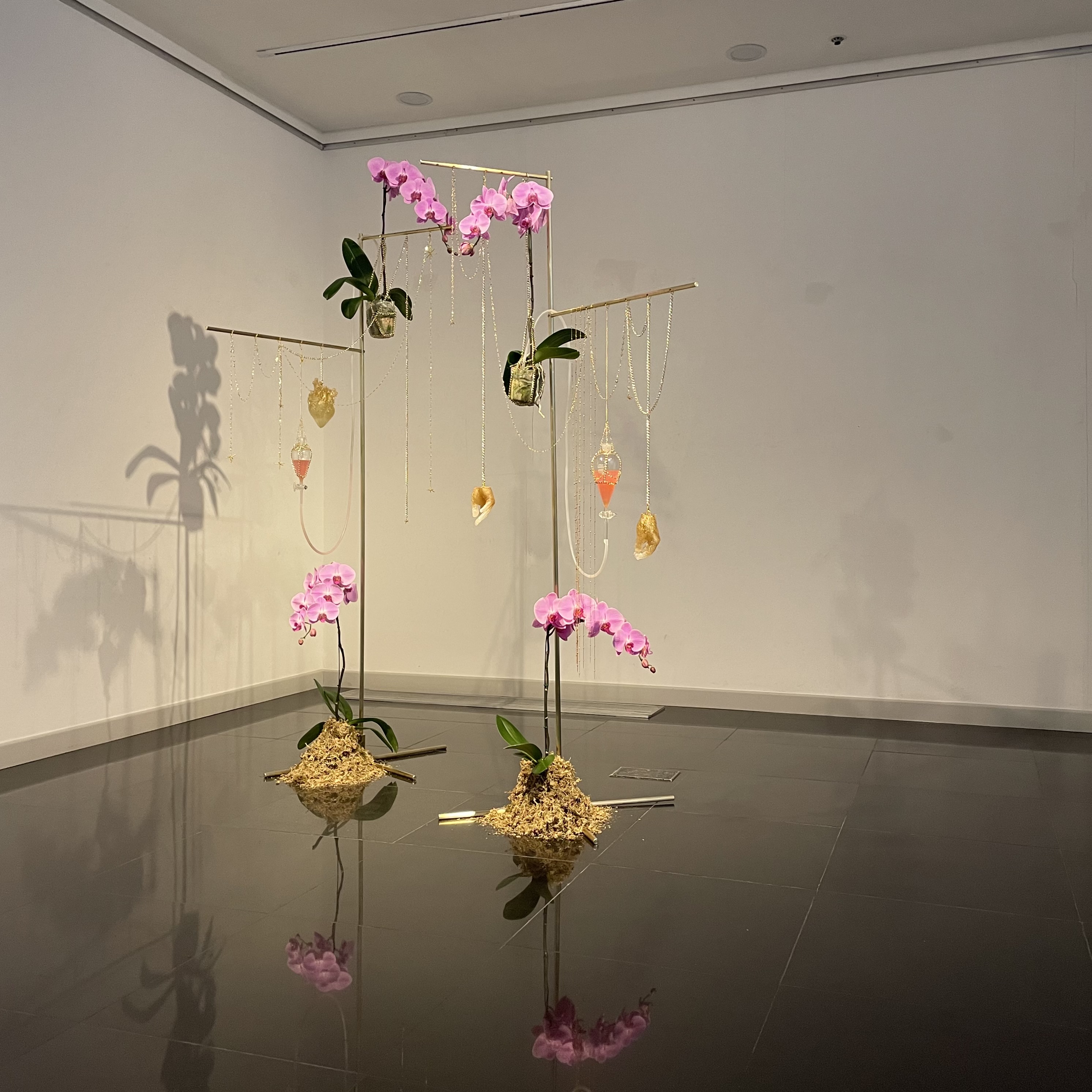 ใREVIVEใ turns its attention to the subtle forces that animate the collective within social structures, focusing particularly on the ritualised gestures through which these forces are enacted. The Phalaenopsis orchid, celebrated for its captivating splendour, paradoxically possesses a stem too fragile to sustain the weight of its own bloom without artificial aids such as external stakes and clips. In response to this contradiction, the artist Ahra Yang conceived Greeting Flowers (2014), in which red Phalaenopsis orchids are grafted onto mechanised stems. Meticulously calibrated by mechanical devices, the flowers appear to have overcome their outward fragility. Yet their simultaneous bowing produces a striking uniformity. As their forms adjust to the gaze of others and synchronise with the rhythm of the system, the strained movements of the orchids quietly invite reflection on how habitualised discipline—often operating unnoticed—gradually standardises behaviour and renders individuals functional components within larger structures.